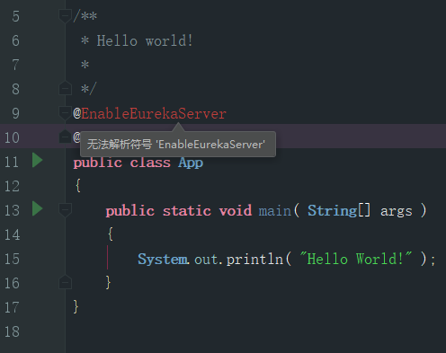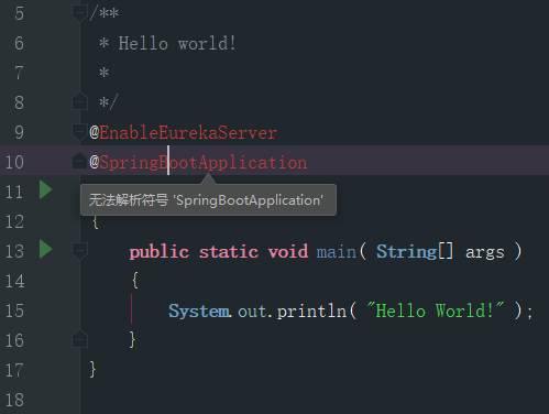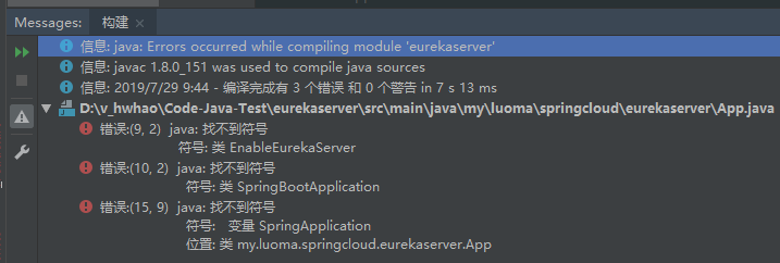无法解析符号 EnableEurekaServer无法解析符号 SpringBootApplication信息:java: Errors occurred while compiling module 'eurekaserver'信息:javac 1.8.0_151 was used to compile java sources信息:2019/7/29 9:44 - 编译完成有 3 个错误 和 0 个警告 in 7 s 13 msD:\v_hwhao\Code-Java-Test\eurekaserver\src\main\java\my\luoma\springcloud\eurekaserver\App.java错误:(9, 2) java: 找不到符号符号: 类 EnableEurekaServer错误:(10, 2) java: 找不到符号符号: 类 SpringBootApplication错误:(15, 9) java: 找不到符号符号: 变量 SpringApplication位置: 类 my.luoma.springcloud.eurekaserver.App
