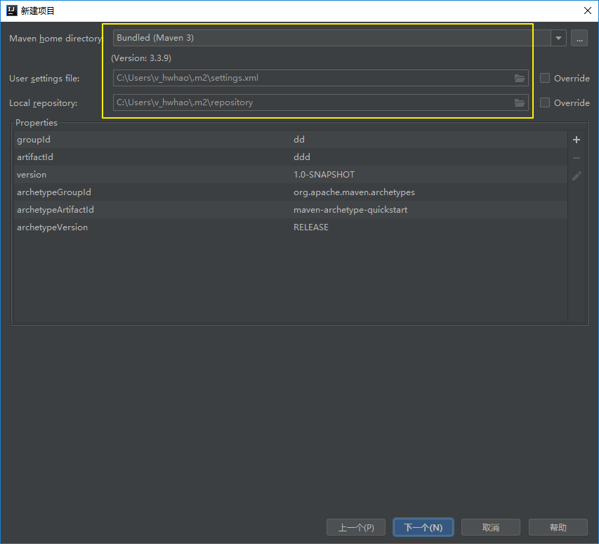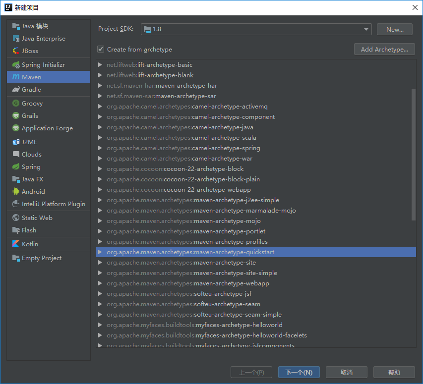 选择项目模板 maven-archtype-quickstart