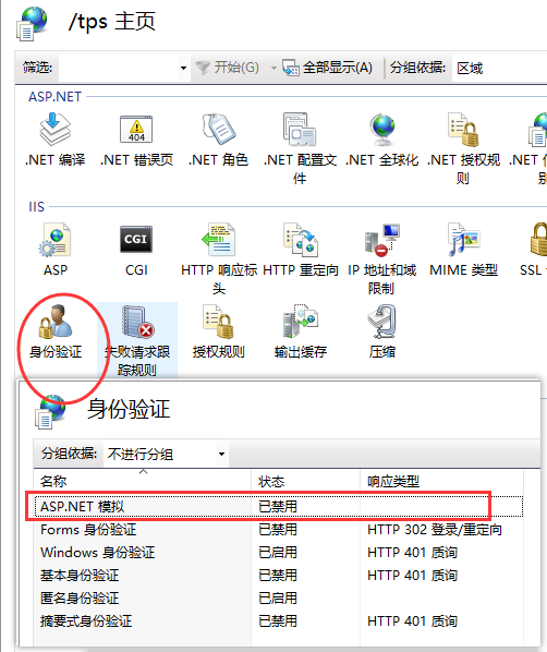 ● 是否启用模拟?为了检查它:“IIS管理器 > 服务器名称 > 站点 > 站点名称> 身份验证> ASP.NET模拟”。