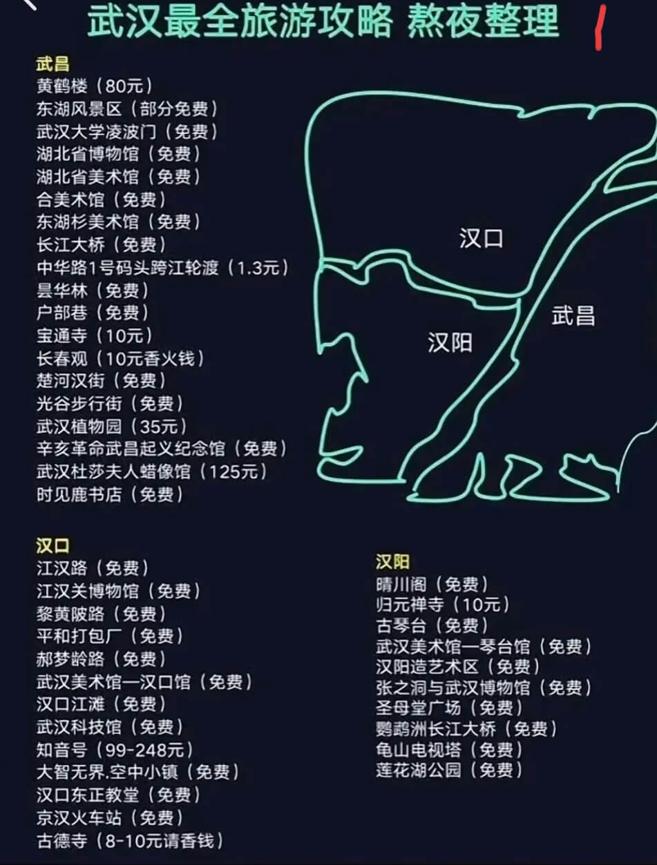 | 2025年10月3日 | 武昌—— ● 粮道街(早餐) ● 昙华林 ● 黄鹤楼 ● 户部巷 ● 汉口江滩,坐轮渡看夜景 ● 下船去万松园(美食一条街) ● 武汉长江大桥 ● 知音号情景剧 | ● 027 LiveHourse ● 利友城(大餐馆) |