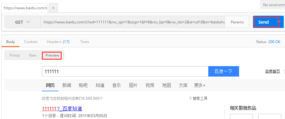 定义好之后,在 No Environment 模式点击 Send 按钮,也可以访问到结果了