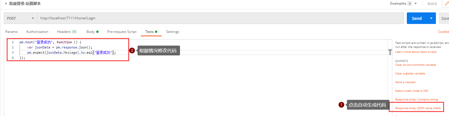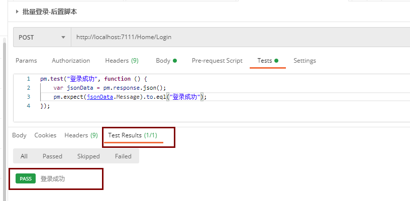 pm.test("登录成功", function () {var jsonData = pm.response.json();pm.expect(jsonData.Message).to.eql("登录成功");});