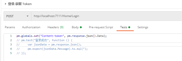 pm.globals.set("Content-token", pm.response.json().Data);// pm.test("登录成功", function () {// var jsonData = pm.response.json();// pm.expect(jsonData.Message).to.eql(");// });